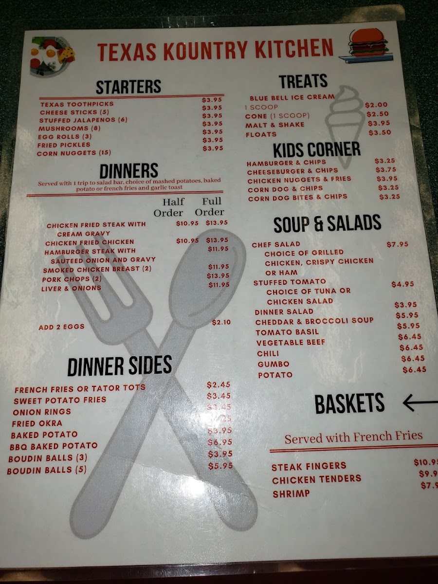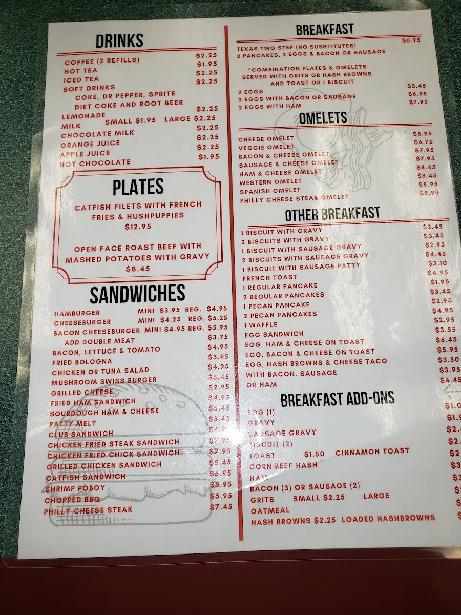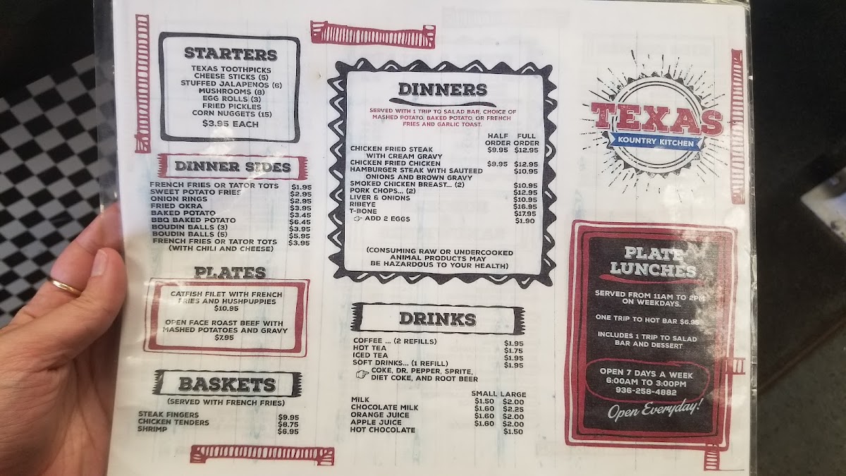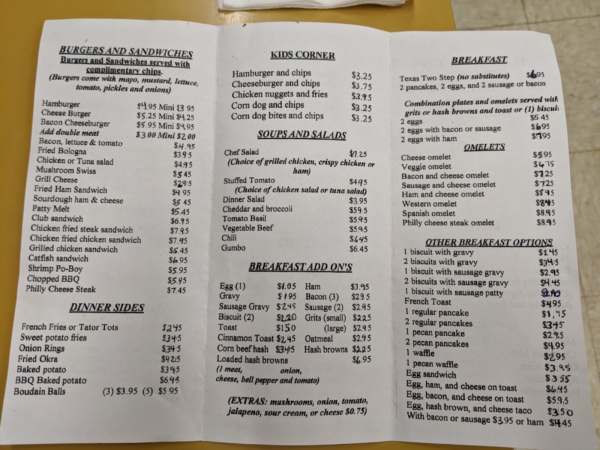 At Texas Kountry Kitchen, located at 313 N Main St, Dayton, TX 77535, we believe that good food and great company can make any day special. Dive into our menu and discover an array of hearty, homestyle dishes that are sure to satisfy your cravings! Start your day with our fluffy pecan pancakes drizzled with syrup or our savory breakfast plate featuring biscuits and gravy, bacon, and scrambled eggs. For lunch, don't miss out on our famous Texas cheeseburger and crispy fried chicken sandwich, accompanied by golden tater tots or zesty onion rings. Whether you're in the mood for a light bite like our delightful chicken salad or a filling club sandwich, we have something for everyone. And don’t forget to wash it down with a classic Coca-Cola! With flavors that embody the essence of Texas hospitality, we invite you to come taste the soul of Kountry cooking!